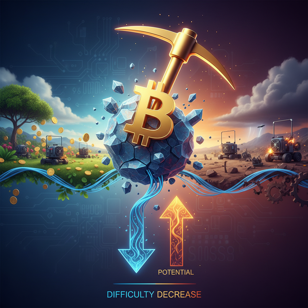 比特币挖矿难度是系统根据全网算力调整的指标,目的是保持出块时间约10分钟不变。当矿工减少或算力下降时,系统会调低难度,让挖矿更容易。这次难度下调 7.7%,意味着过去一段时间内有部分矿工退出或暂时停挖,导致矿工总算力下降。